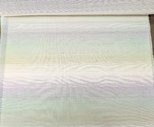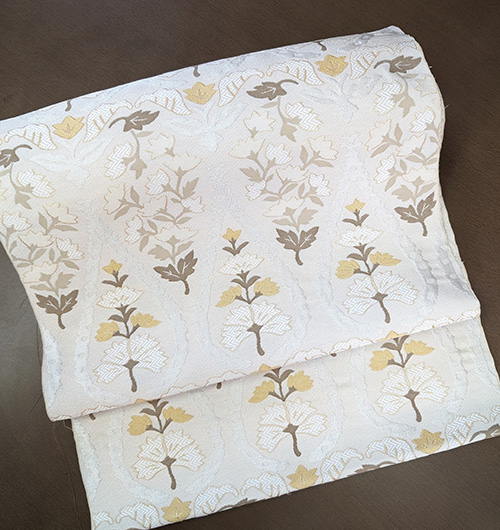 白地に柔らかな色調で織られた名古屋帯はシンプルでありながら格調も高く幅広くお締めいただけます。