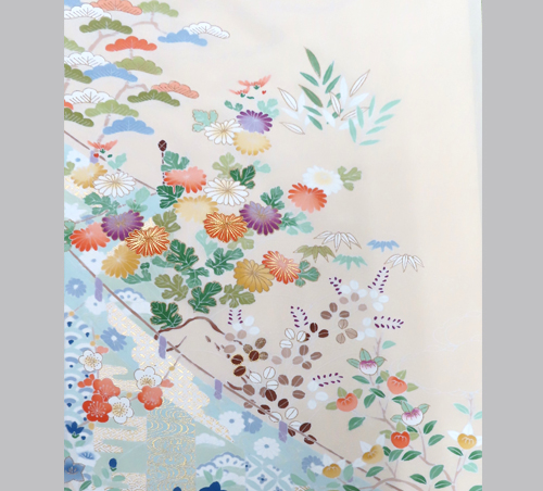 菊には細かな刺繍も施されています。仕立て上がると訪問着と同格の格調高い付下げ着尺です。