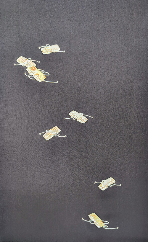 こげ茶色の地色に5センチほどの文箱が肩、上前と入っています。