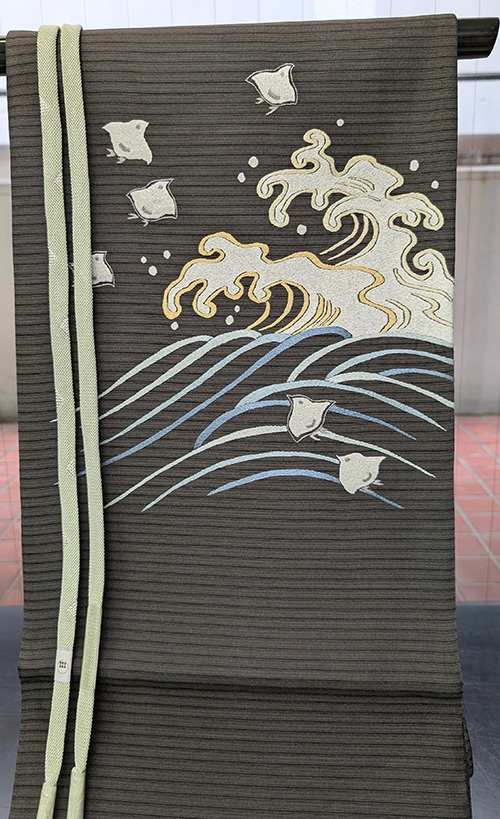 消し炭色の絽の生地に荒々しい波その中を可愛い千鳥が飛んでいます。