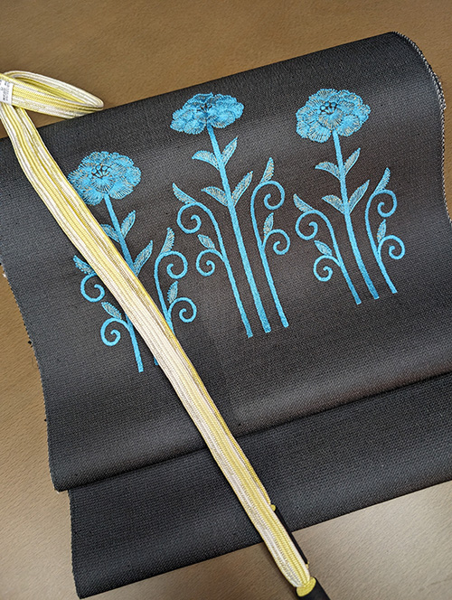 納戸鼠色の地色に浅黄色の刺繍でカーネーションを刺しています。